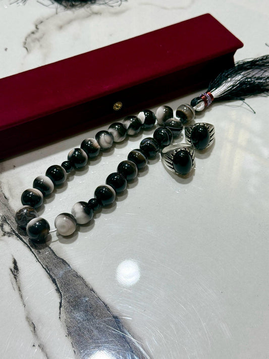 Black Aqeeq 18 mm Black and white Tasbih With Men's Ring